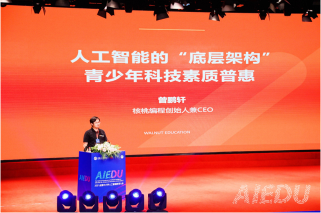 7月20日-21日,2021全国中小学人工智能教育大会在中国人民大学附属中学举行,国务院参事、CAAI理事长、中国工程院院士戴琼海,中国工程院院士、第三世界科学院院士李国杰,中国人民大学附属中学党委副书记王晓楠,中国人民大学高瓴人工智能学院院长文继荣等全国著名中小学校长、人工智能专家、教育专家、一线教师以及科技教育从业者出席会议,聚焦“智能时代的青少年创新人才培养”主题进行交流探讨。核桃编程创始人兼CEO曾鹏轩受邀出席,并就《人工智能的“底层架构”:青少年科技素质普惠》进行主题分享。