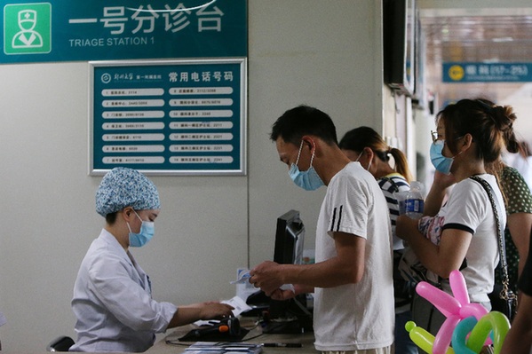 7月26日,患者在郑大一附院河医院区诊室外排队分诊。