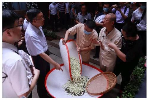 世界遗产大会主席田学军等一行领导在闽榕茶业董事长王德星的带领下,参观了解了隐藏在大众茶馆背后的茉莉花与茶的历史脉络。非遗传承人陈晓峰现场演示了福州茉莉花茶窨制工艺,闽榕董事长、非遗大师王德星做详细讲解,“这只是福州的窨制工艺中的冰山一角,真正的窨制过程是极其考验制茶师傅的手艺和功力的”。现场的嘉宾领导纷纷称奇,感慨茉莉花的传奇与非遗的魅力。