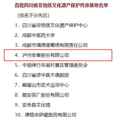 近日,第一批四川省非物质文化遗产保护传承基地名单正式公布,经过地方部门推荐申报、专家评审、实地考察等程序,泸州老窖股份有限公司作为传统技艺类代表,在全省众多遴选对象中脱颖而出,最终入选首批四川省10个非遗传承基地,并成为川酒企业中唯一入选单位。