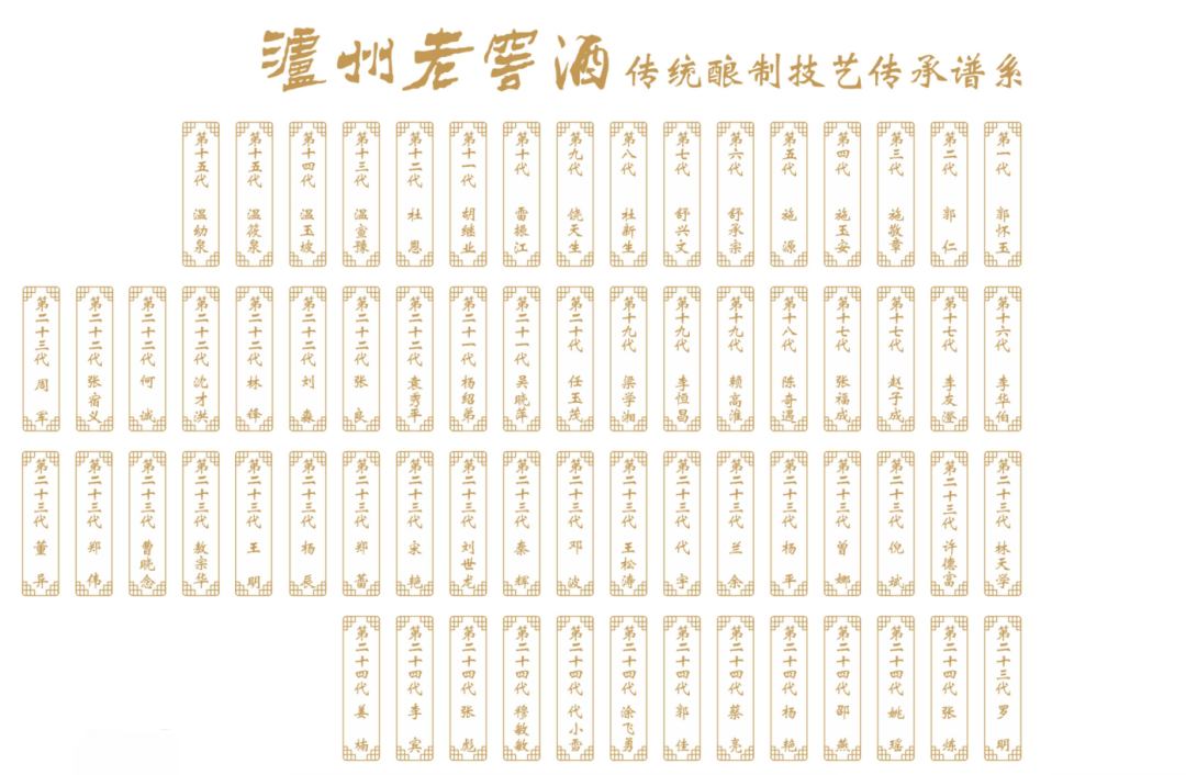 泸州老窖酒传统酿制技艺经元、明、清三代创制、定型及成熟,师徒相承、口传心授,从未间断,流传至今已690余年,并传承至24代。