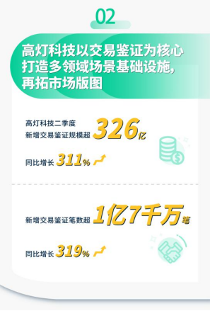 高灯科技以交易鉴证为核心,打造多领域场景基础设施,二季度,新增交易鉴证规模超326亿,同比增长311%;新增交易鉴证笔数超1亿7千万笔,同比增长319%,交易鉴证业务得到健康快速增长。