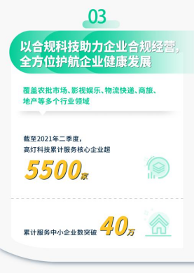 目前,高灯科技交易鉴证服务平台包含监管科技、合规科技两大板块。其中,合规科技面向企业用户提供一站式合规解决方案,方案通过SOA组件模型、Hbase储存结构、AI-BOT等底层系统,建立逻辑规则,在事件决策、风控规则、模型规则三大风控引擎的指导下搭建应用工具,形成被监管认可的评审体系,帮助平台企业有效规避合规风险、降低合规成本、助力业务创新。截至2021年二季度,高灯科技累计服务核心企业5500家,累计服务中小企业数突破40万。涵盖农批市场、影视娱乐、物流快递、商旅、地产等多个行业领域。