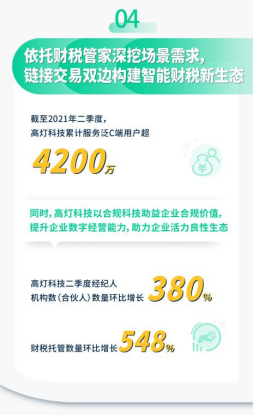 2021年二季度,高灯科技通过“交易双边的合规关系、财税服务的交付关系、人企协同的管理关系”三大连接创新能力释放了业绩发展的新动能,交出亮眼的成绩单。未来,高灯科技将继续以交易鉴证为核心进行合规创新,不断深耕更多领域场景,引领企业数字化转型,助力行业合规发展,为“财税科技”时代的加速到来释放强劲动能。