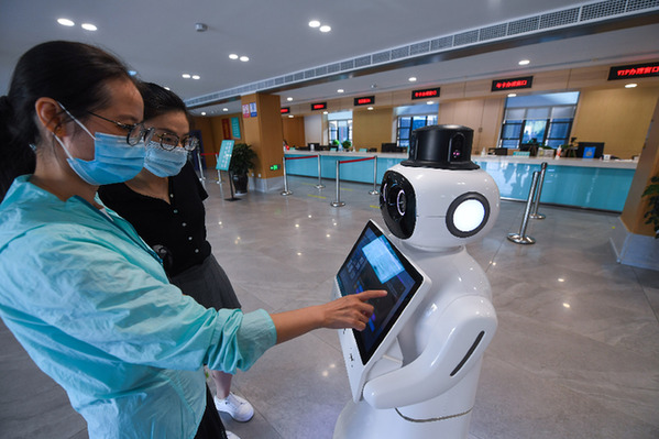 9月26日,在完成升级改造的朱家尖南沙景区游客中心,游客通过智能机器人查询。