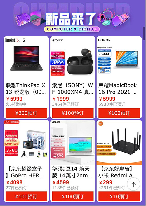 在笔记本电脑品类中,微软、华硕、联想、荣耀、华为等品牌持续上新,预付少量定金即可锁定优惠价,并享受超值礼赠。比如,拥有高能生产力与多屏协同智慧体验的荣耀MagicBook 16 Pro轻薄笔记本,预售优惠500元;外观纤薄灵动,具备超清视界和硬核强芯的联想ThinkPad X13锐龙版高性能轻薄本,定金200元即可锁定;李现同款Surface Pro 8 轻薄本,预定赠李现ING联名礼包;十分能打的潮玩新次元华硕天选2笔记本,预售享6期免息。京东电脑数码11.11预售新品云集,福利加码,全面满足消费者商务办公、学习娱乐等各种“追新”需求。
