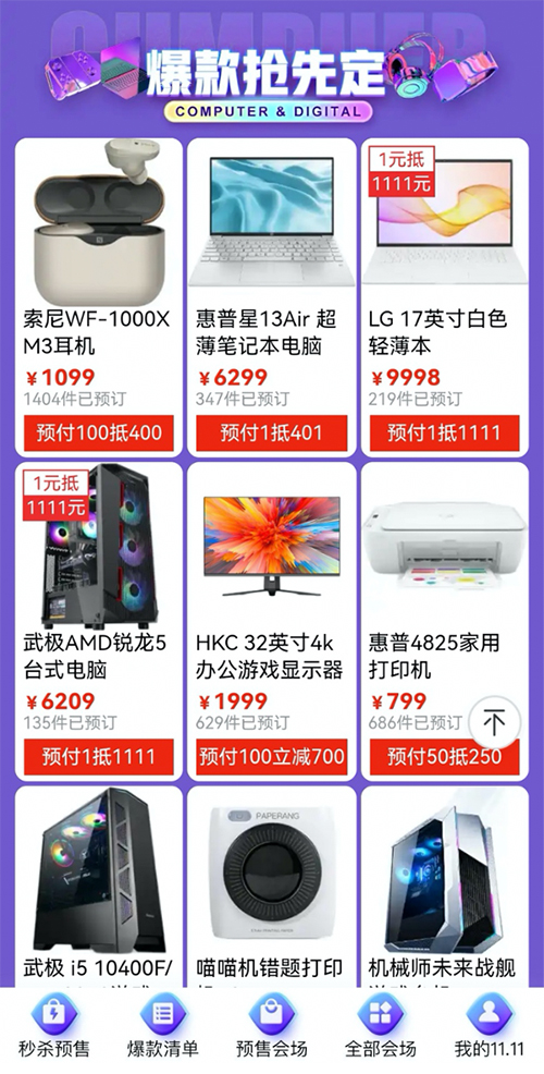 除了海量新品备受瞩目,超值爆款也是11.11抢购重点,今年京东电脑数码11.11预售爆款抢先定,不用拼手速。有业界盛名的索尼WF-1000XM3真无线蓝牙降噪耳机,降噪技术加持一上市就人气爆棚,预付定金100元抵400元;打印复印扫描一机搞定的惠普DJ4825彩色无线喷墨打印机,预付50元抵250元;2K高清屏轻薄小巧的LG gram 2021款轻薄本,兼顾工作娱乐多场景,预付1元抵1111元;微边框高清不闪屏的HKC 32英寸显示器,预付100元立减700元。还有罗技G502无线鼠标、索尼A7M3全画幅微单相机、喵喵机错题打印机P2等热销爆款商品,均有预付定金膨胀抵尾款的优惠,力度之大,令人心动。