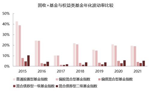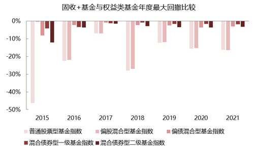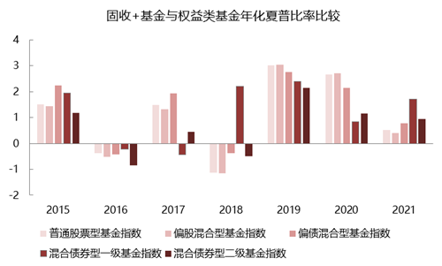 数据来源:Wind,2021年数据截至2021年11月9日,采用混合债券型一级基金指数、偏债混合型基金指数、混合债券型二级基金指数代表固收+类产品,偏股混合型基金指数、普通股票型基金指数代表普通权益类基金。指数过往表现不预示基金表现,投资需谨慎。
