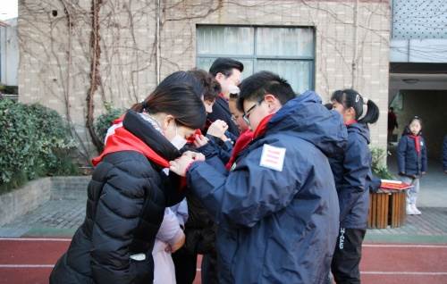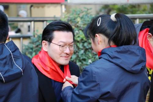 图:南京石鼓路小学优秀少先队员们为中传华夏代表佩戴红领巾