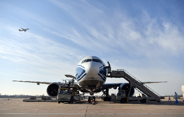 12月30日,机场工作人员在为一架俄罗斯空桥货运航空公司货机进行装货准备。