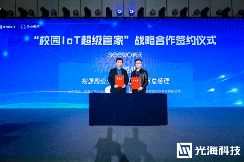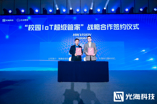 活动现场,光海科技还与海康威视、希沃正式进行了签约合作仪式。王振东董事长对此次签约非常重视,他表示:将上游的供应商和saas服务、下游的经销商与合作伙伴和终端用户联系在一起,构建完整的教育生态圈是光海科技一直以来的愿望。海康威视是行业领先的以视频为核心的智能物联网解决方案和大数据服务提供商,希沃(seewo)是视睿科技在教育领域的自主品牌,诞生于2009年,作为教育信息化应用工具提供商及服务提供商,是国内交互智能平板品类首创者,2012年-2019年连续8年蝉联中国交互智能平板行业市占率桂冠*,是行业标杆企业。今天光海科技与海康威视、希沃签署合作也是希望能够建立更多的连接,在教育生态当中的校园层面的生态创造更多的价值,相信和海康威视、希沃的合作下,能一起助力推动教育信息化的发展、提高校园数字化、智慧化、智能化水平。