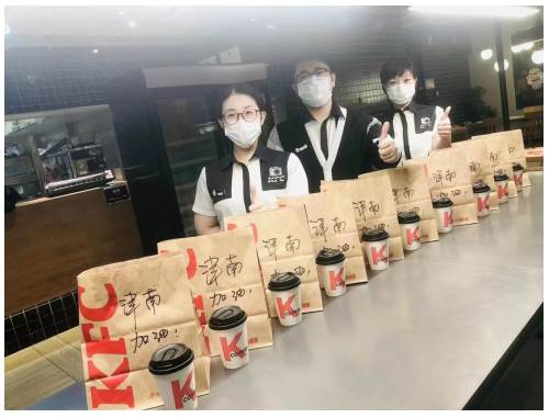 1月8日晚首先发现的两例感染者均住在津南区丰达园小区,小区紧急封控,连夜进行核酸检测。距离小区一公里的肯德基津沽餐厅经理小福听到这个消息,马上决定为一线抗疫工作者送爱心餐,并联系周边餐厅支援。不到一个小时,爱心餐点已经送到一线抗疫工作者手中,防疫组领导很惊喜,“谢谢肯德基想着我们!”