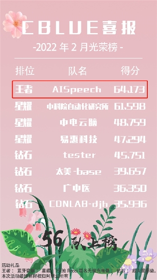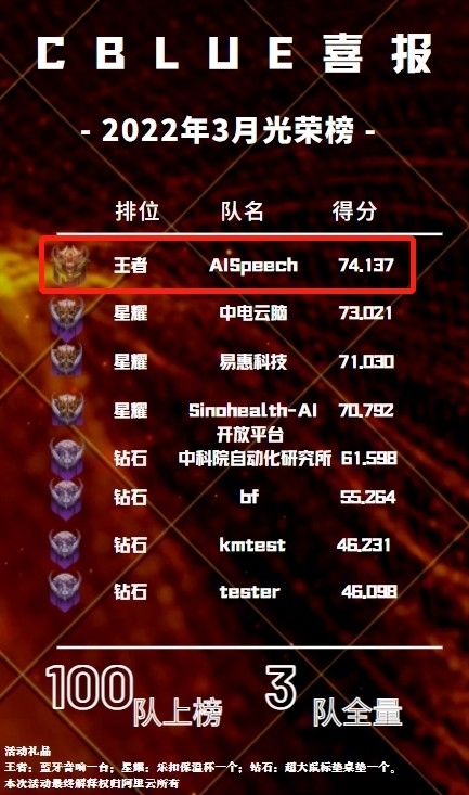 思必驰团队在2月、3月榜单中蝉联冠军,4月榜单结果敬请期待……