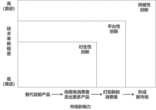 如上图,横轴代表企业的产品如何逐步引领市场,纵轴由下往上表示企业投入技术的革新程度,当中的三种创新方式应对市场的变化。以苹果公司为例,苹果公司在2001年就推出了最初的便携式多媒体播放器iPod,直接改变了人们听音乐的方式。后续iPod产品在不断优化创新升级成iPod nano、iPod Classic等衍生产品,这一阶段属于苹果公司的衍生性创新。后来乔布斯意识到智能手机时代可能带来的威胁,是继续创新iPod赢得销量还是采取其他方式?乔布斯则是选择了用投入资源研发另一款大获成功的创新产品来替代——iPhone手机。这一阶段则属于苹果公司所经历的突破性创新阶段。苹果公司在平台性创新也大有作为,推出以iPhone手机为链接支点的App Store、iPad、Apple TV等平台性的产品,也是大大地引领了电子产品的潮流。