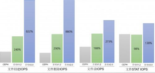 以最具代表性的文件操作性能为例,对比CEPH、青鸾V1.2、青鸾V2.0的性能数据。下述为单台2NVME SSD + 10 HDD的申威6B服务器下的实测数据取整。