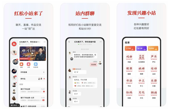 不仅如此,红松通过独有的“小站模式”,为站长(主播)提供运营工具,向粉丝提供直播、群聊、空间、聚会等功能,通过“兴趣课直播+实时互动+社群”的组合方式,打造从内容到社交的闭环服务,进一步让用户获得在长期陪伴、同好交流等精神需求上的满足。