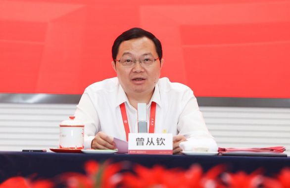 图为五粮液集团(股份)公司党委书记、董事长曾从钦在会上作交流发言