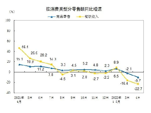据国家统计局数据,今年1-4月全国餐饮收入13262亿元,同比下跌5.1%,其中4月同比下跌22.7%。