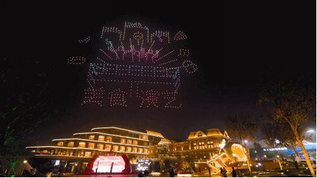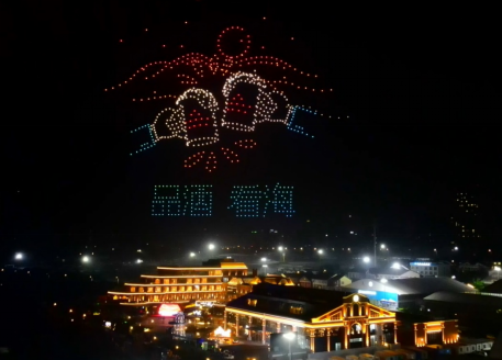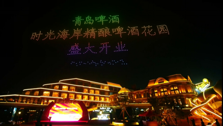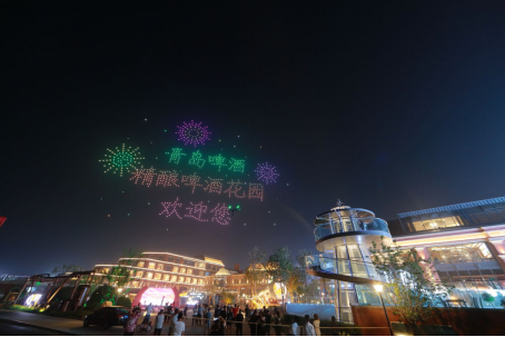 在游人、市民的阵阵欢呼声中,上千架无人机同时起飞,如星河般把金沙滩的夜空装点得绚烂璀璨, 12幅星空造型,复刻出青岛啤酒·时光海岸精酿啤酒花园的建筑造型和六大时尚业态。