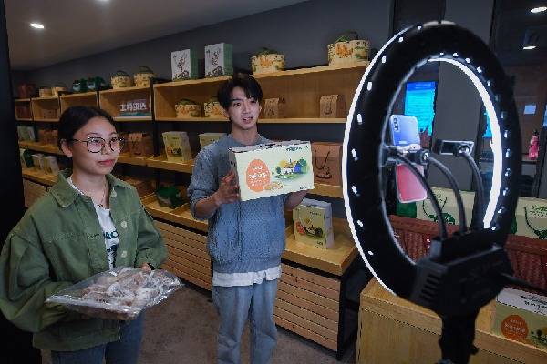 浙江省杭州市富阳区湖源乡的青年志愿者在“村播学院”直播间进行特色农产品网上直播推介。