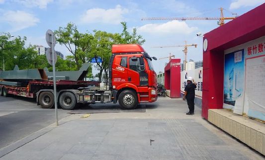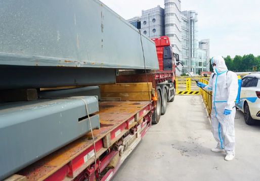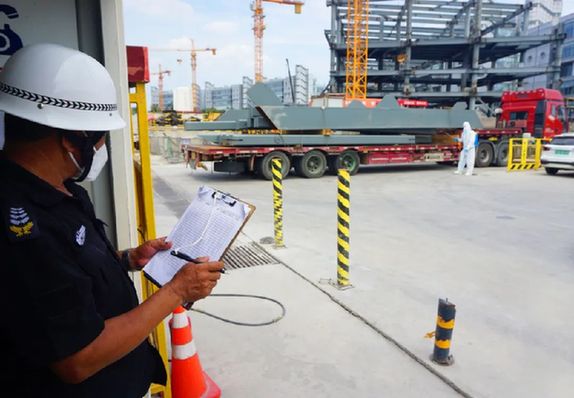 工地大门外,一辆工程运输车正前来运送建材。安保人员及时上前,请司机完成“数字哨兵”扫码、抗原自测、体温检测,并核实核酸阴性报告和登记车辆信息,并告知司机进入施工区卸货时非必要不下车。在完成一系列防疫要求后,方可进入缓冲区,对轮胎、车门等重点部位进行全面消杀。