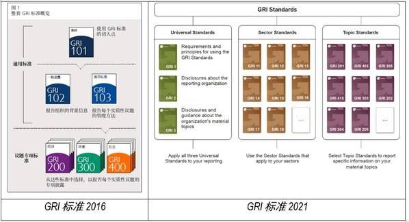 GRI标准2021版中的议题专项标准也同样进行更新,首先便是由2016年的 议题专项标准(Topic specific Standards) 更新为2021年的 议题标准(Topic Standards) 。