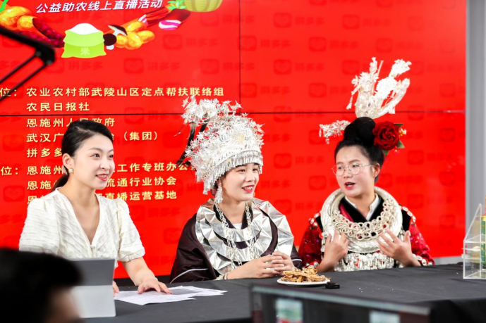 本场直播,农业农村部武陵山区定点帮扶的湖北恩施州咸丰县、来凤县,湖南湘西州永顺县、龙山县,贵州黔东南州剑河县,以及恩施州恩施市、利川市、建始县、巴东县、宣恩县、鹤峰县有关负责人,带着“农民网红”助播,轮番走进拼多多的寻鲜记直播间,向全国网友、消费者推介当地山水文化资源、直播带货。