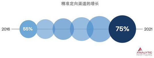 Analytic Partners勘讯咨询的ROI Genome数据显示,各品牌从广泛覆盖往更精准的定向营销策略的转变是显而易见的。 2021 年,在由营销驱动的总销售额中有75% 来自能够进行精准定向营销的渠道(例如社交媒体、展示型广告、线上视频),而五年前该比例仅为 55%。