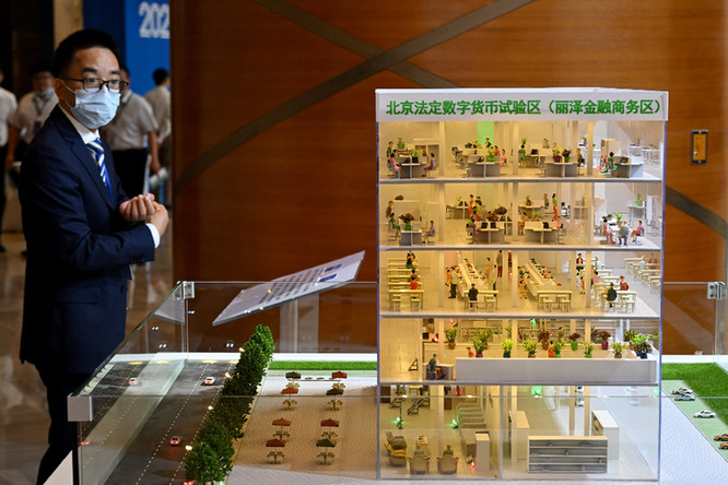 在数字金融论坛设置的数字人民币体验区,一名与会者观看丽泽数币一卡通的应用场景模型。记者 李鑫 摄