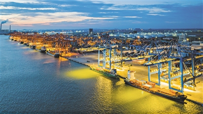 华灯初上的钦州港(2022年9月13日摄,无人机照片)。钦州港是我国西部陆海新通道铁海联运的重要枢纽。昔日闭塞的小渔村已蝶变为繁华的现代化国际枢纽海港。 新华社记者 张爱林 摄