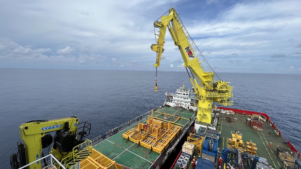 图为此次投用的深水水下生产系统的重要组成部分—深水水下管汇正准备由工程船实施安装。(图片来源:中国海油)