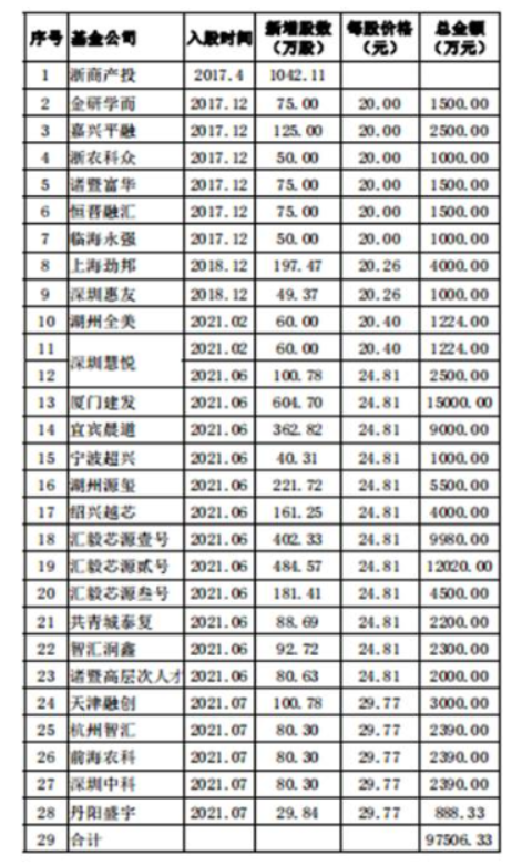 紧随其后的是金研学而、浙农科众、嘉兴平融、诸暨富华、恒晋融汇、临海永强,这些机构均于2018年1月以20.00元/股的价格增资入股帕瓦股份;2018年12月,上海劲邦、深圳惠友以20.26元/股的价格增资入股帕瓦股份;2021年3月,深圳慧悦又以20.40元/股的价格增资入股帕瓦股份;2021年6月份厦门建发、宜宾晨道、绍兴越芯、汇毅芯源壹号、汇毅芯源贰号、汇毅芯源叁号、智汇润鑫、诸暨高层次人才以24.81元/股的价格入股帕瓦股份;2021年9月天津融创、杭州智汇、前海农科、丹阳盛宇以29.77元/股的价格入股帕瓦股份,该次系帕瓦股份本次IPO前最后一次股权转让,整体估值达30亿元。