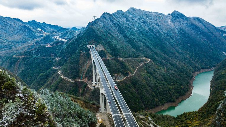 12月28日,车辆从贵阳至黄平高速公路贵定互通连接线甘溪特大桥上通过(无人机照片)。 当日,位于贵州省贵定县境内的甘溪特大桥顺利建成通车。甘溪特大桥是贵阳至黄平高速公路贵定互通连接线的控制性工程,大桥全长1220米。 新华社发(邓刚 摄)