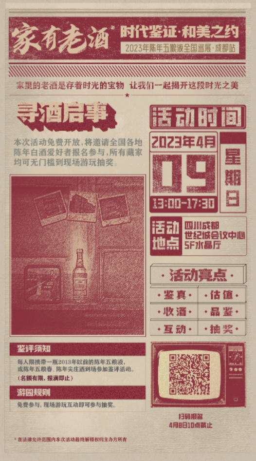 “五粮液家有老酒”2023陈年五粮液全国巡展成都站活动即将于4月9日开启,来自全国的陈年白酒收藏家、鉴赏家及爱好者将齐聚蓉城,共赞老酒独特价值,共赏老酒传奇故事,共品老酒时代风味。