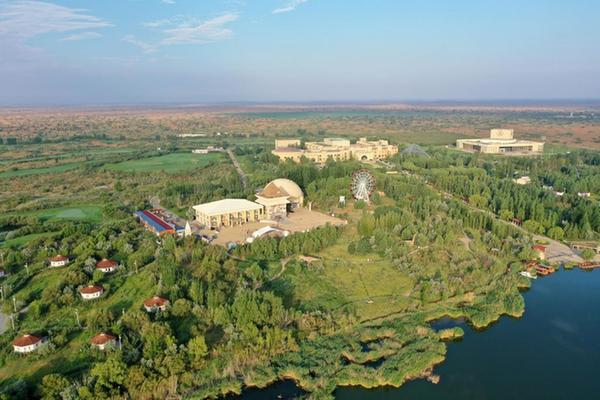 这是内蒙古鄂尔多斯市库布其沙漠腹地的七星湖景区(2021年7月17日摄,无人机照片)。新华社记者 金良快 摄
