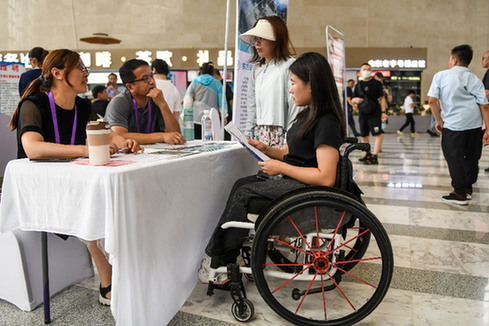 求职者在山东省残疾人就业专场招聘会上咨询岗位信息。资料照片