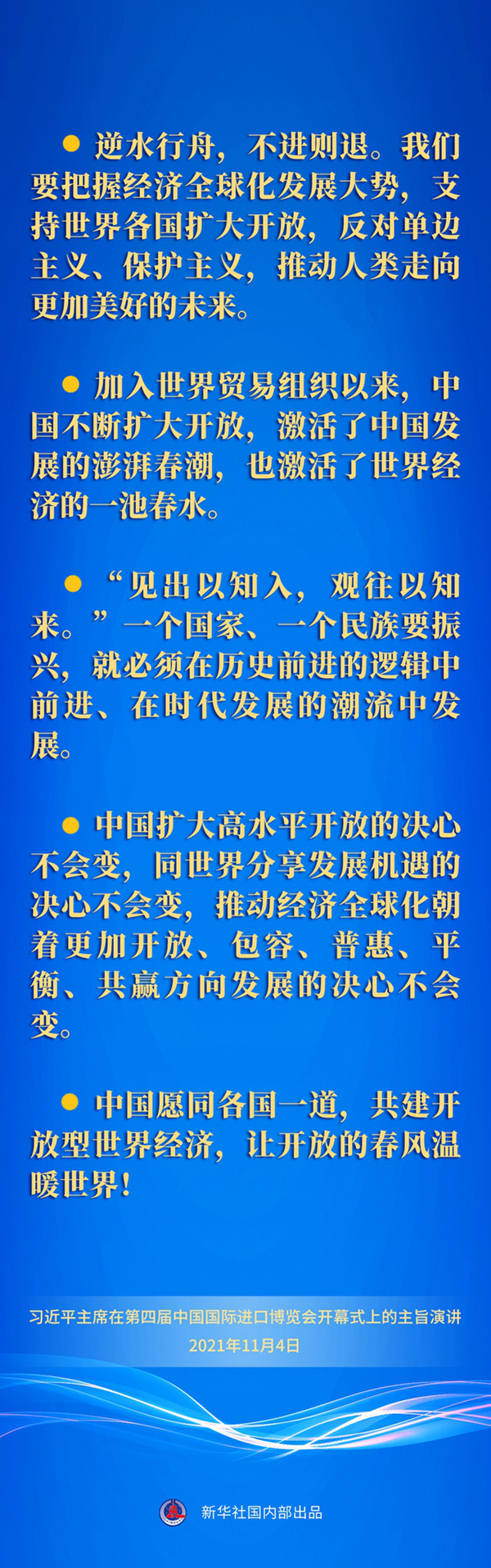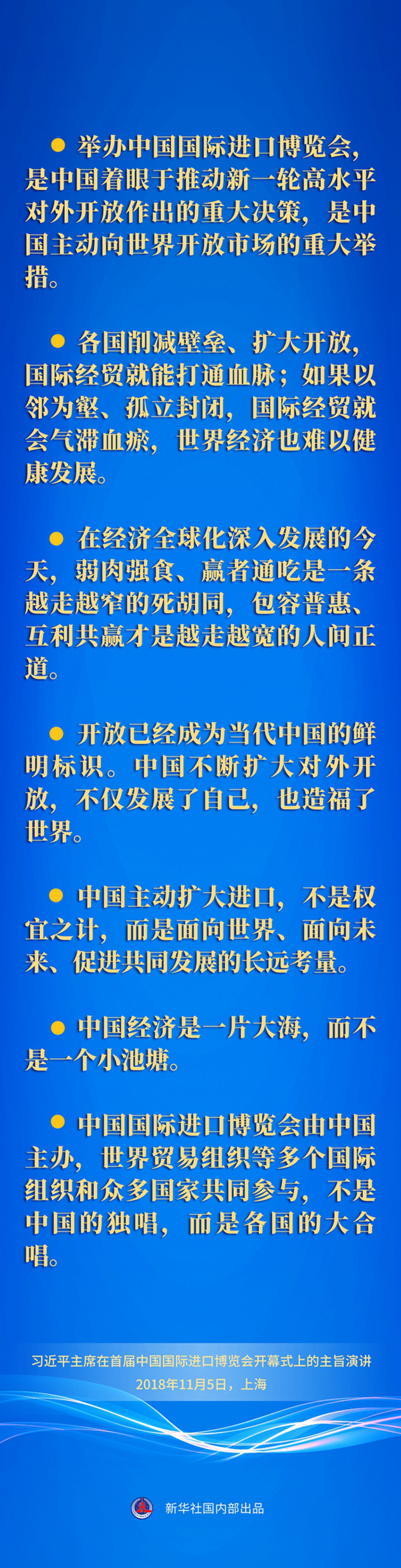 五次重要宣示,传递出中国坚定不移推动高水平开放的坚定决心,同世界共享市场机遇的真诚愿望,为构建开放型世界经济贡献中国力量的不变承诺。
