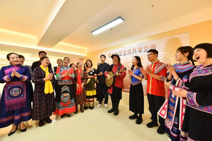 近日,在社区新时代文明实践站,居民在唱山歌。新华社记者 黄孝邦 摄