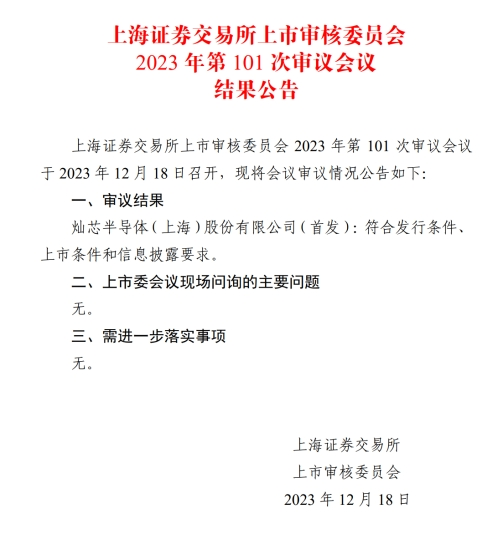 12月18日,据上海证券交易所上市审核委员会(简称“上交所上市委”)2023年第101次审议会议结果公告,灿芯半导体(上海)股份有限公司(简称“灿芯股份”)符合发行条件、上市条件和信息披露要求。审议会议结果公告显示,上交所上市委对其并无问询问题、无需进一步落实事项,直接过会。