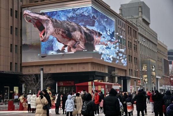 北京,王府井商业街。以百货大楼及懋隆两处裸眼3D屏幕为核心,多屏数字联动串起王府井六个公共大屏,琉璃金龙在金街大屏穿梭,吸引游客驻足观赏。消费场景、品牌上新,王府井商业街人气旺盛。