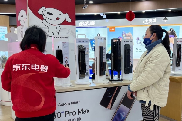 消费者在云南昆明市中心的一家京东电器旗舰店选购智能门锁(2024年2月14日摄)。新华社发(张文强 摄)