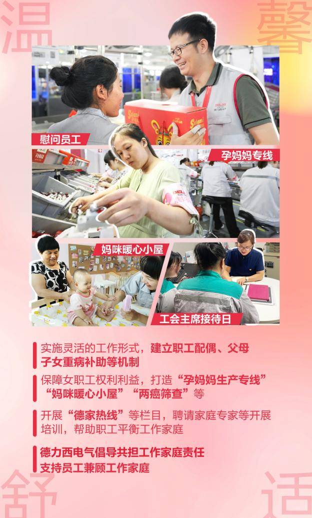 实现工作与家庭的和谐平衡向来是提升员工幸福感的重要保障。为提升德家人对工作与生活的满足感,德力西电气在倡导职工共担工作家庭责任方面做出了诸多努力。德力西电气开展“德家热线”等栏目,同时聘请家庭方面的专家对职工进行培训。在家庭帮助方面,德力西电气还实施灵活的工作形式,同时建立职工配偶、父母、子女重病补助等机制,多方面考虑职工家庭需要。此外,德力西电气也积极推进各项呵护女性健康、服务女性需求的温馨服务,打造“孕妈妈生产专线”、“妈咪暖心小屋”、“两癌筛查”等,全力保障女职工权利利益。