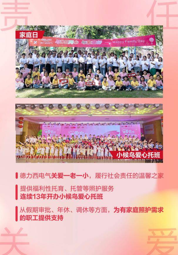 德力西电气同样关注社会责任的履行,关爱一老一小,重视职工的照护需求,提供福利性的托育和托管服务。德力西电气已连续13年开办小候鸟爱心托班,惠普员工子女达到4500余人次,不仅减轻了员工的家庭负担,而且为员工子女打造了一个“学”“教”“乐”一体的成长基地。此外,德力西电气依法依规落实假期制度,从假期审批、年休和调休等方面支持有家庭照护需求的职工,确保他们能够在家庭生活中承担必要的角色,同时保持职业发展。