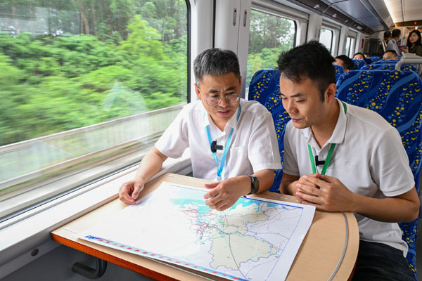 图为当日,中铁第一勘察设计院集团有限公司广佛南环总设计师韩振江(左)介绍刚刚投入运营的广佛南环、佛莞城际铁路的设计思路。记者 刘大伟 摄
