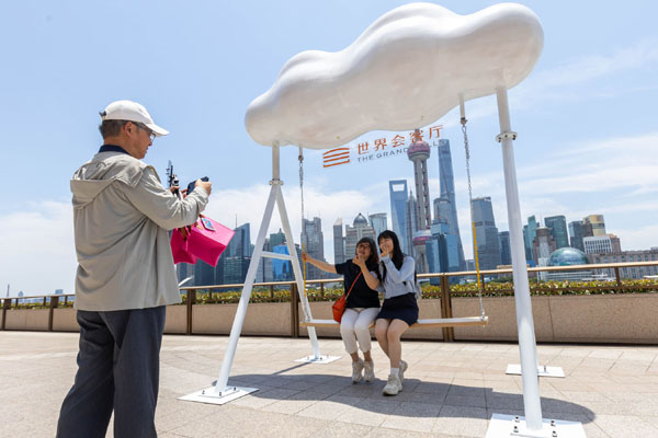 图为市民在上海世界会客厅户外观景平台拍照留念。