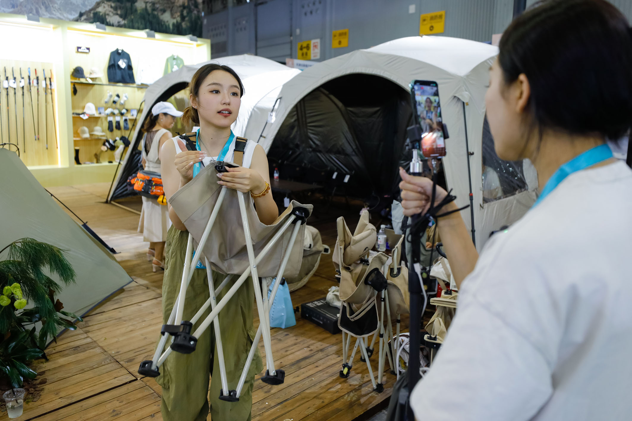 在CLE中国(成都)户外露营生活展上,一名直播达人(左)通过互联网直播销售户外露营产品。