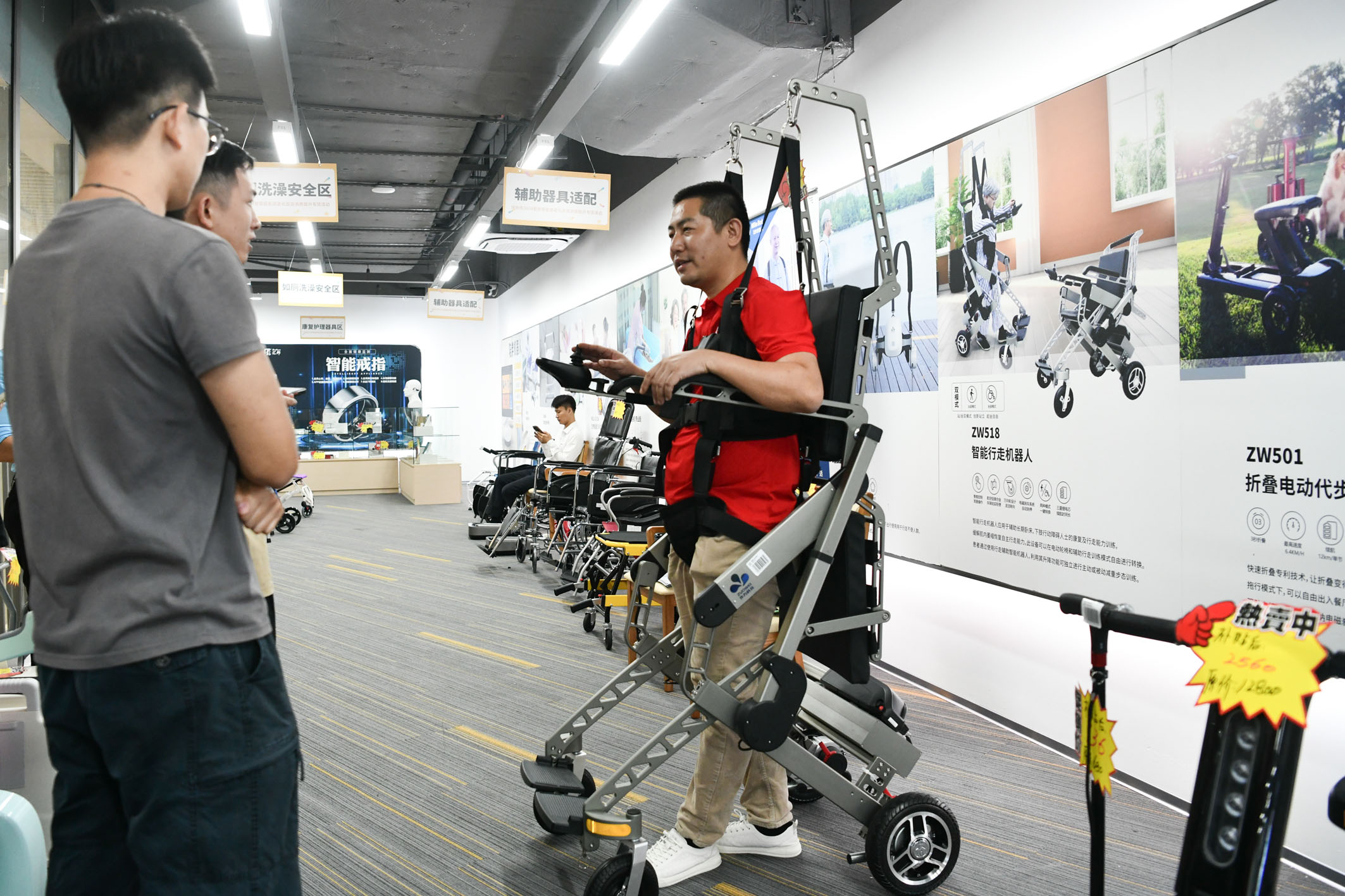 日前,位于深圳的老年用品商场“深业·健康汇”向市民开放,展示居家安全、娱乐生活、智能照护等50余个品类、数百种智能居家适老产品。图为工作人员在演示一款智能行走机器人。