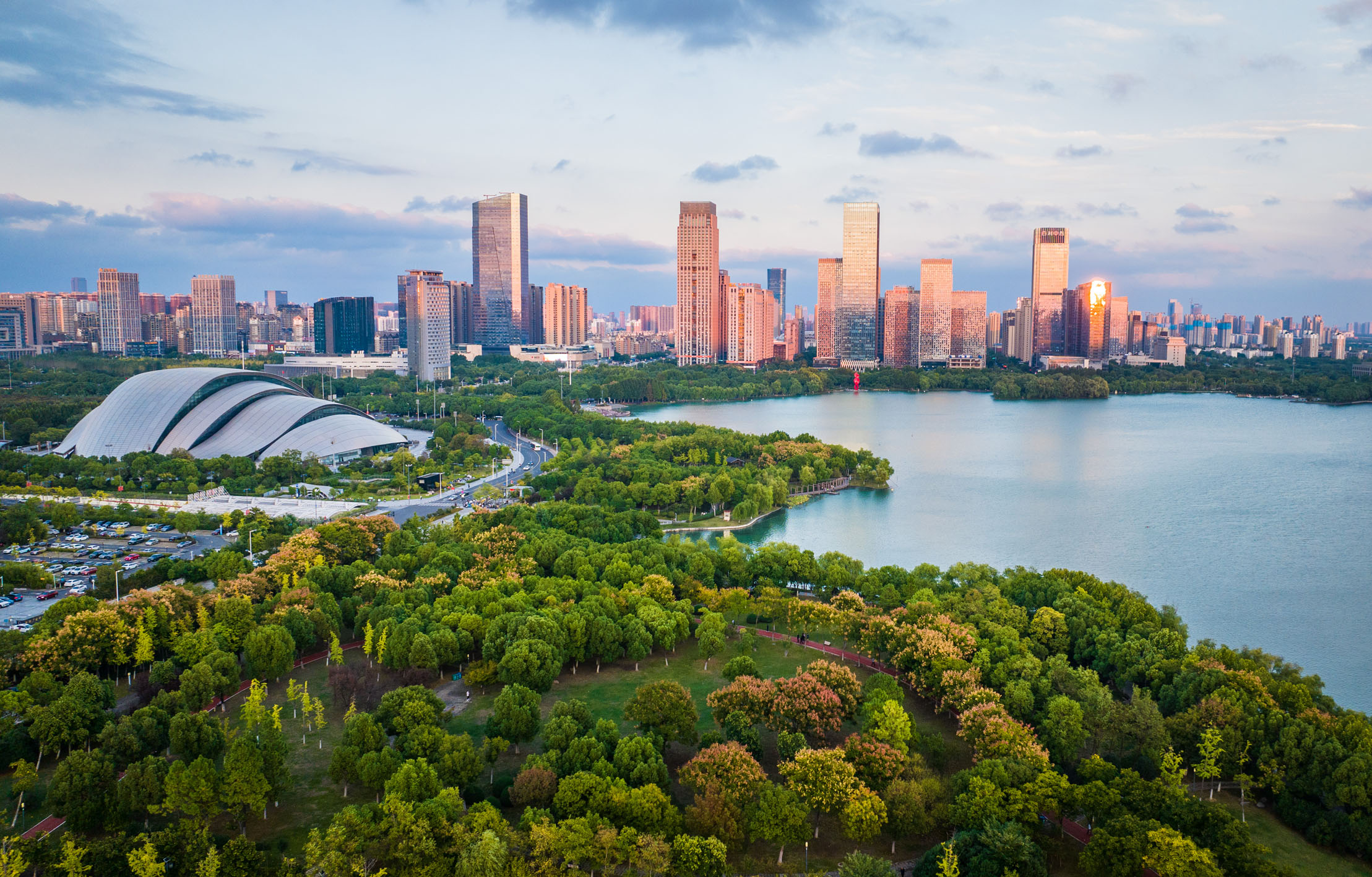 今天的合肥,在新时代勇当科技和产业创新的开路先锋,正成为一座科创之城。大科学装置,承载人类点亮聚变能源的美好愿景;量子科技、人工智能,让人们感受到科技前沿的合肥力量;中科大、科学岛,是这个城市“科里科气”的独特气质;京东方、联宝、大众、蔚来……这些新兴产业地标澎湃着城市的“向新力”。图为合肥市天鹅湖(2024年9月18日摄,无人机照片)。