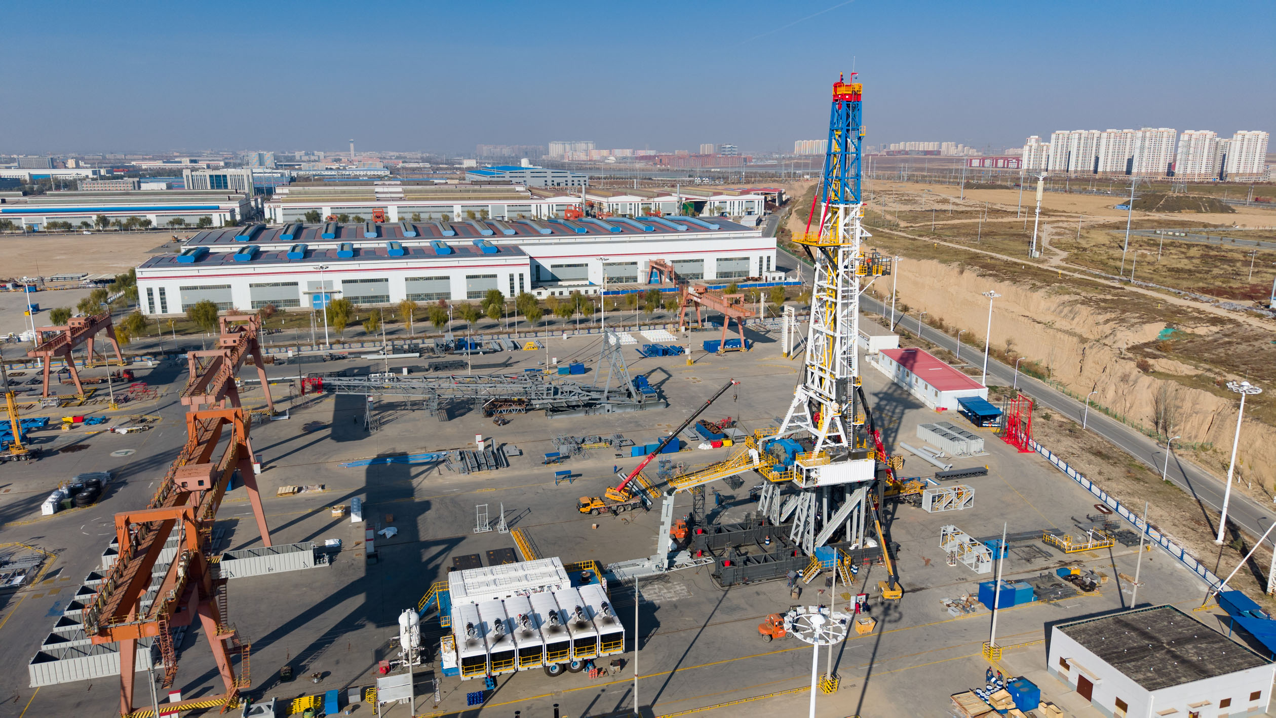 图为近日工人在兰州新区兰石集团高端装备产业园内调试一台即将出口的3000HP超深井沙漠快速移运钻机(无人机照片)。2012年8月,全国第五个、西北地区首个国家级新区——兰州新区获批设立。12年来,兰州新区产业投资、工业增加值年均增长30%以上,累计引进优质产业项目1300多个、总投资6000亿元。