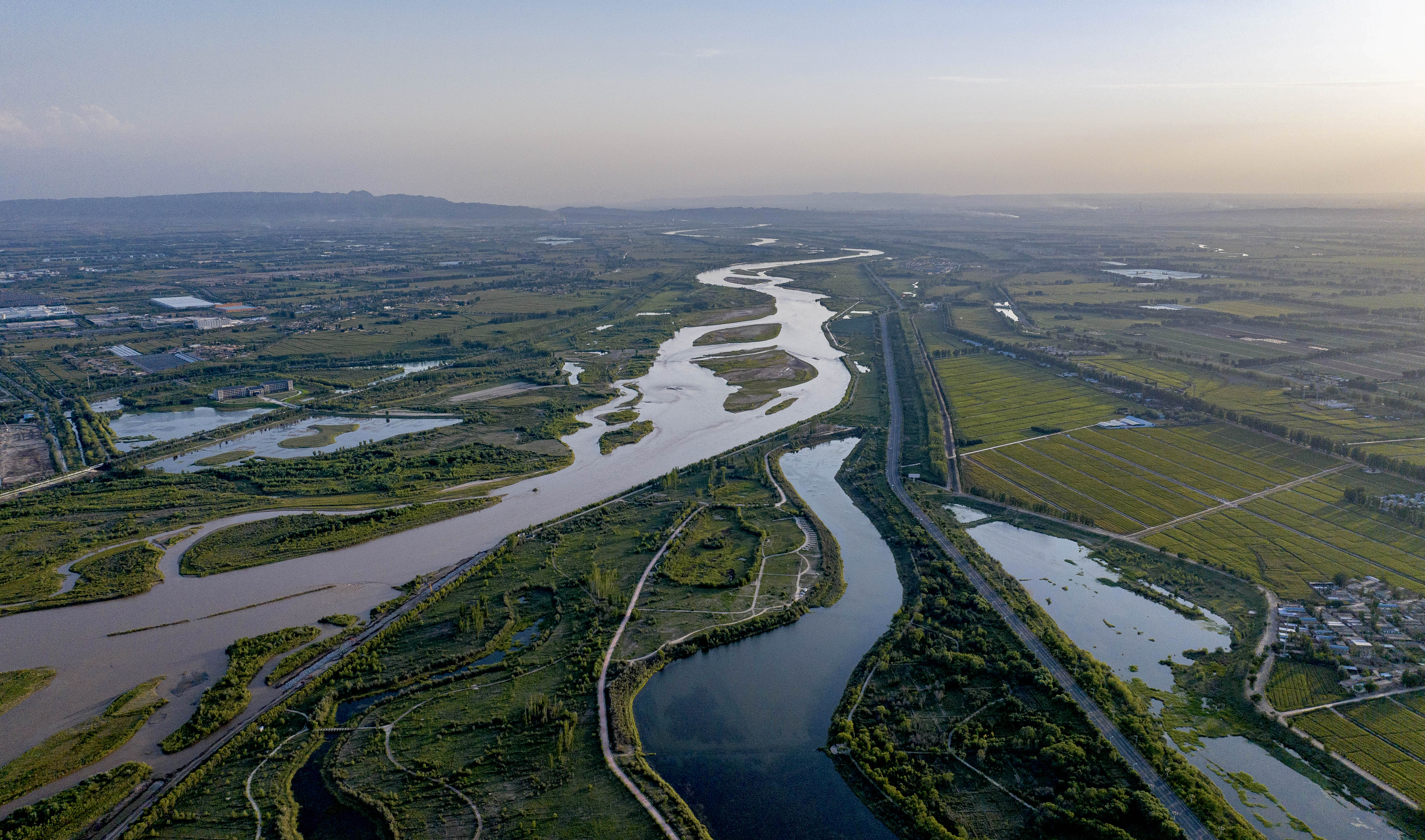 在宁夏吴忠市利通区拍摄的黄河(无人机照片)。 记者 杨植森 摄
